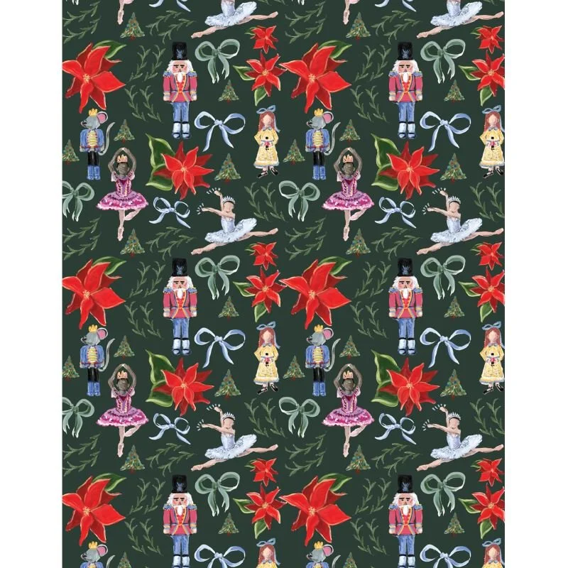 With a gloss finish, the paper features a bright party scene with signature Nutcracker characters, poinsettias, bows, and greenery.